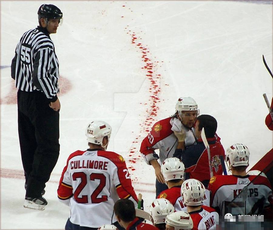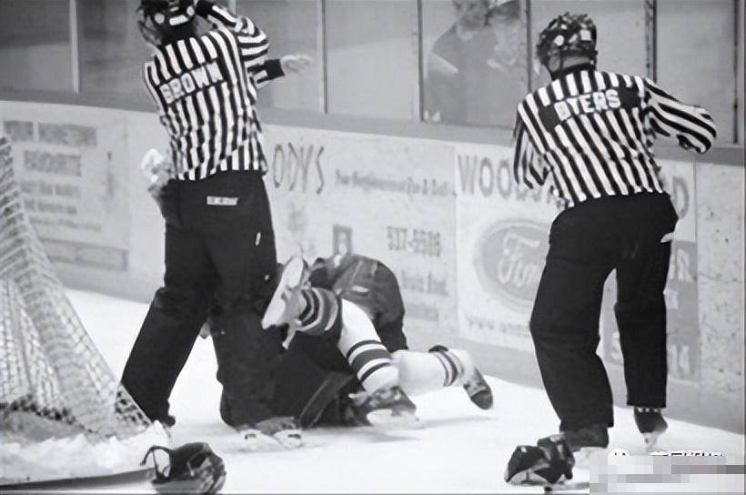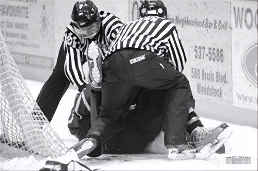 类似的事故还有很多。2010年,加拿大安大略乌斯托克冰球赛场上,年仅25岁的边裁Brown在劝架时被队员的冰刀割颈,血流不止,当场昏迷。