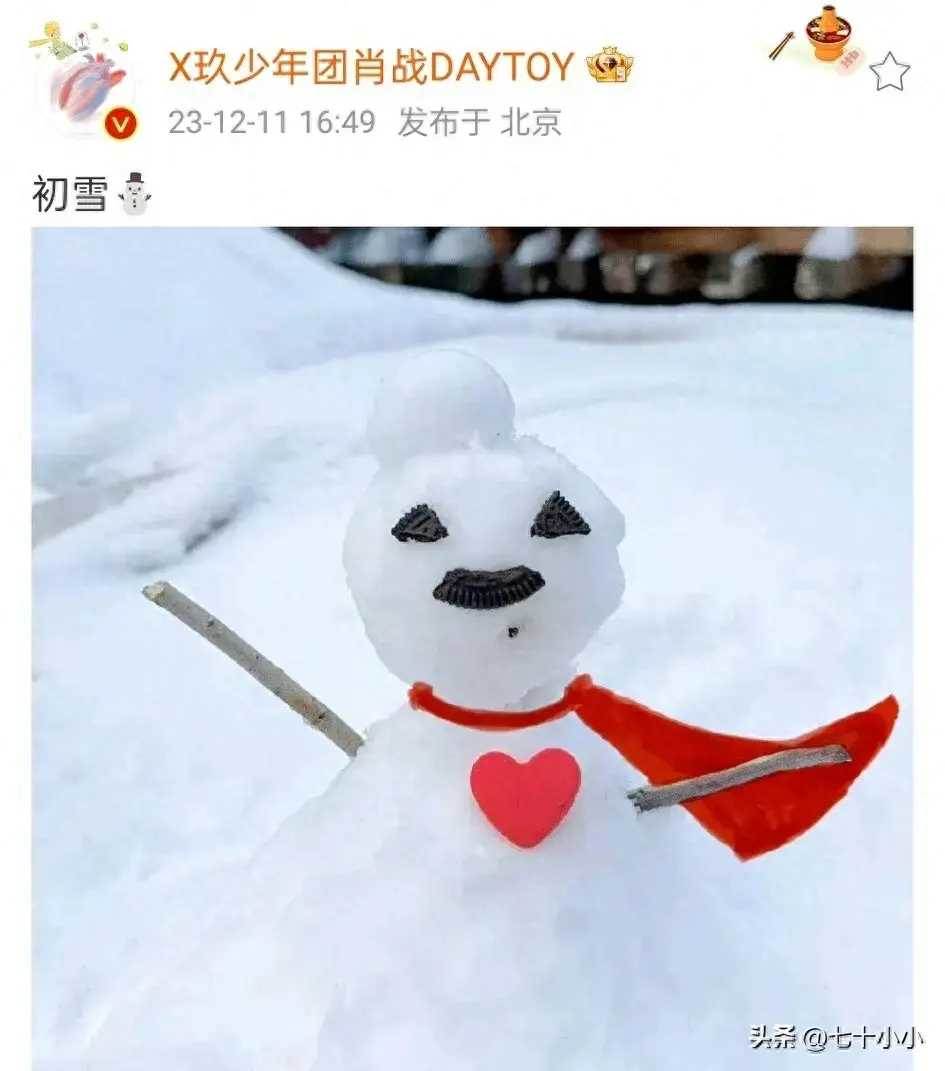 肖戰文案是初雪兩個字,配了一個小雪人的表情包!也是看出他歡心雀躍的心情!肖戰曬出的圖片里是一個小小的雪人!雪人很是精致秀氣的模樣,除了雪人的胸前有個愛心之外,肖戰還自己后期畫了個披風上去! 這個披風也是引起了大家很多的猜想!很多網友也是紛紛在評論區討論起這個紅色的披風。喜歡肖戰的朋友們都對這個披風不陌生,因為肖戰的粉絲是小飛俠!