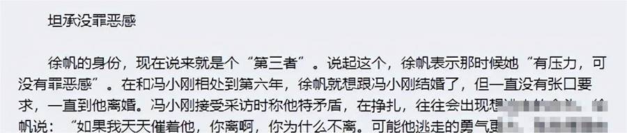 和大部分「小三」慣用的說法一樣,愛情成了徐帆加入張娣和馮小剛婚姻的最佳理由。
