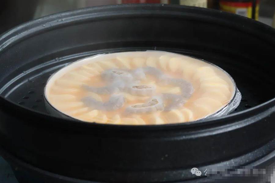 6.盤子上包上保鮮膜或者蓋上一個盤子。鍋里水開上鍋蒸15分鐘左右。蓋上保鮮膜為了防止鍋蓋上的水滴落到菜里。