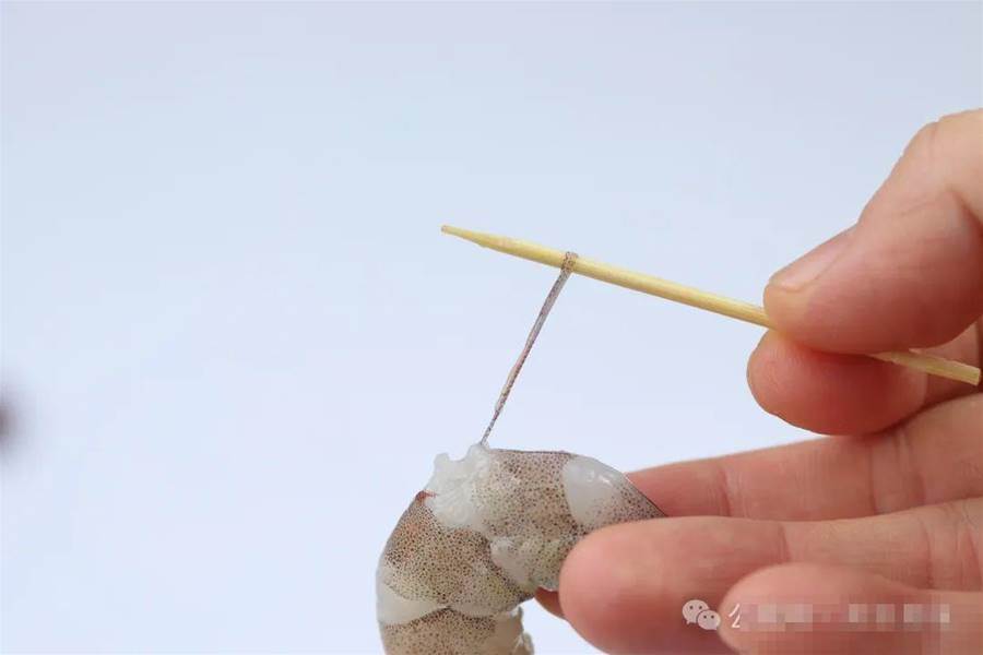 4.基圍蝦從背部第3節處用牙簽挑出蝦線。基圍蝦營養豐富,含鈣、鋅量比較多,也是優質的蛋白質來源。