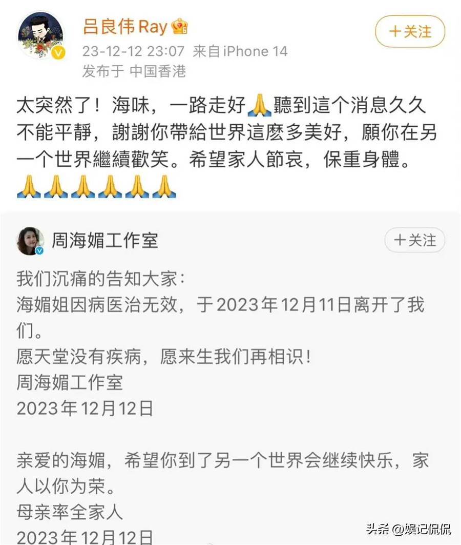 另外,周海媚的前夫呂良偉也發文悼念,56個字的文案,字字催淚,他還首次喊出了兩人曾經的專屬甜稱「海味」,情真意切的表白讓人瞬間淚目。