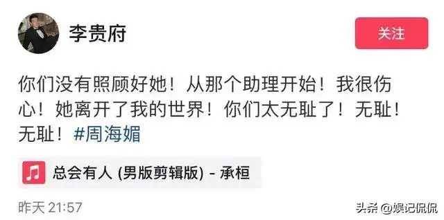 值得一提的是,在周海媚去世的消息剛被公布,她的「緋聞男友」李貴府也立馬發文,疑似怪怨助理沒有照顧好周海媚,才導致了現在的結局,言辭十分的激烈。