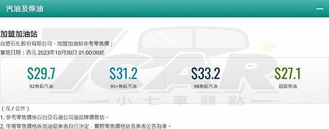 考量國際油價走勢、新台幣兌美元匯率、國內市場競爭力,及日本政府為抑制油價擴大補助供油商,導致亞鄰最低價格下跌等因素後,決定自 2023 年 10 月 30 日(週一)凌晨 01:00 開始,調降汽油批售價格 0.2 元/公升,柴油批售價格 0.2 元/公升,市場零售價格由加油站自行決定。