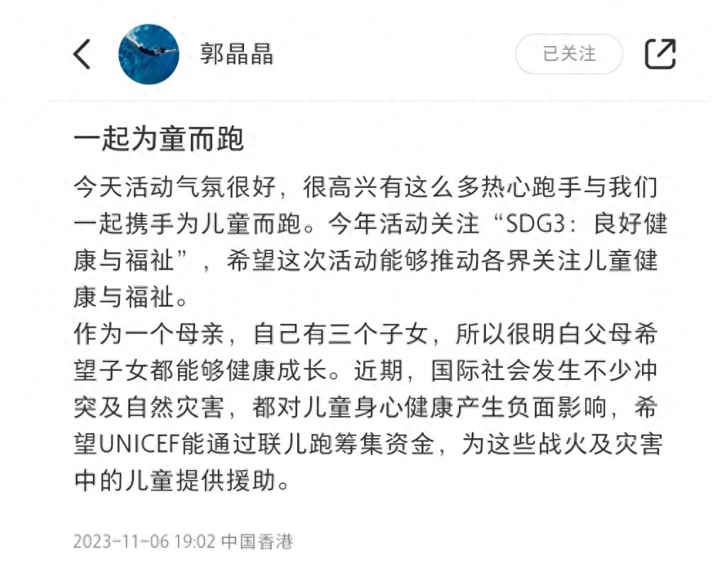 11月6日晚,郭晶晶在個人社交平台分享了一組和老公霍啟剛帶三個兒女參加公益跑活動的照片,并發文:「一起為童而跑」。為了這次公益跑,郭晶晶也是花足心思,和老公霍啟剛帶著三個兒女齊齊上陣,相信三個寶貝對于這場公益活動也是收獲滿滿。