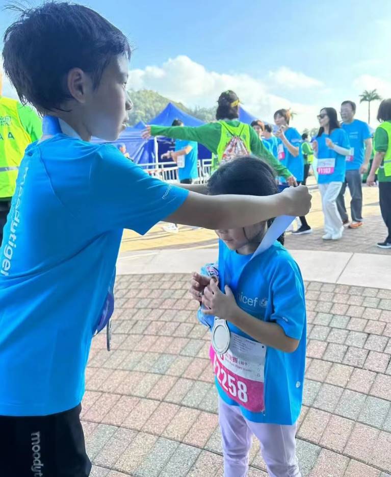 跑步結束后,霍中曦還為小妹戴上了獎牌,好有意義啊。雖然兄妹倆都沒有露出正臉,但霍中曦隨著漸漸長大,是真的越長越帥氣了。妹妹同樣是高顏值萌寶一枚,她長得既像爸爸又像媽媽,可愛得不得了。