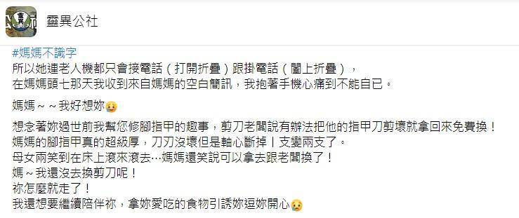 母女倆相處的時光,就連剪指甲這件小事也變得有趣,讓她難掩崩潰情緒:「媽媽我真的好想妳……」表示自己都還沒去換剪刀啊,媽媽怎麼就走了,哽咽向媽媽喊話:「我還想要繼續陪伴您,拿妳愛吃的食物逗妳開心。」