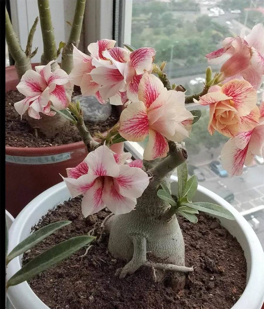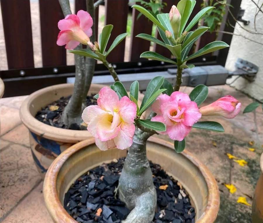 沙漠玫瑰就怕多澆水,水一多就「黑腐爛根死」,因為它就像美麗的孕婦,圓滾滾的大肚子儲存著大量的水分,而且還是熱帶沙漠植物,耐旱力比較強,喜干怕濕。