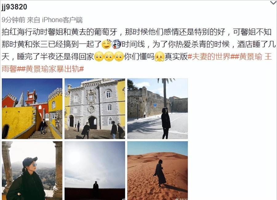 比如2018年《紅海行動》的三個月后,她又在黃景瑜播出《結愛》時,發文爆料了他疑似出軌張藝上的信息,還發布了「小三」疑似趁自己不在家時的自拍照。