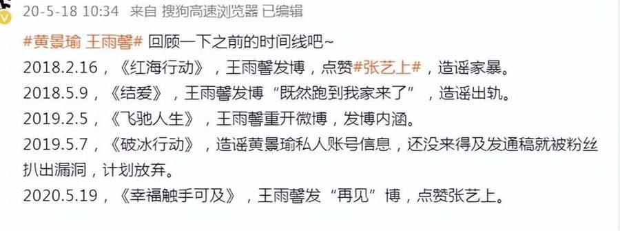 半年之后,《紅海行動》上映的同一天,王雨馨出面點贊張藝上,并稱自己遭遇了黃景瑜的出軌和家暴。