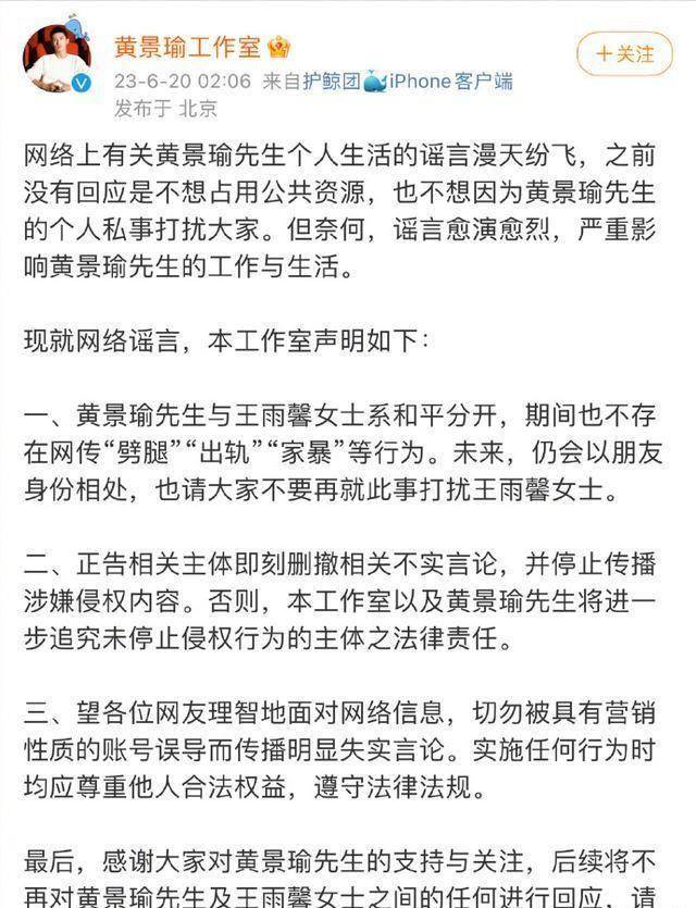 這一切終于導致黃景瑜發文回應了之前的種種,聲明中他承認自己與前妻和平分手,但不存在出軌、家暴等行為。