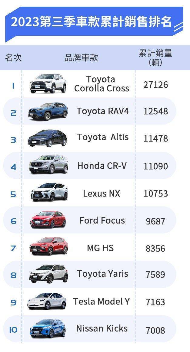 擠進前10名的車款和第二季結束時相同,僅名次變動幅度有些大,首位仍由Toyota Corolla Cross穩坐,值得一提的是,前三名都由豐田拿下,以往常踞前三的Honda CR-V,由于改朝換代之際有一小段「交車空窗期」,因此自第二名退至第四,第三季結束居于第八的Toyota Yaris,也會因告別台灣市場,估計年終結算時,名次會再下滑。