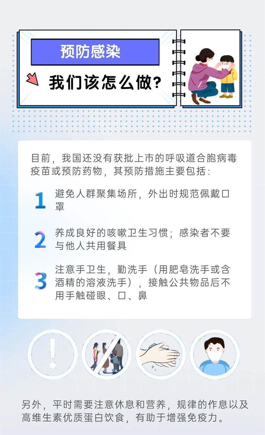 由于RSV廣泛流行,國內正在積極研發針對60歲以上老年人,以及0至6月嬰幼兒的呼吸道合胞病毒的疫苗。目前,兩種特異性單克隆抗體:帕利珠單抗、長效單克隆抗體尼塞韋單抗已在國外獲批使用,用于高危人群預防RSV,相信將來我們將會有更多有力武器對抗RSV。