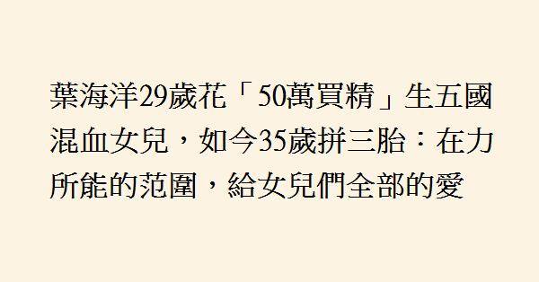 當時葉海洋也知道,自己的年紀不小了,不打算錯過生育年齡的葉海洋左右為難。思來想去後, 葉海洋既不願意委屈自己,又想要一個屬于自己的孩子,于是只能走出了買精生子這一步。