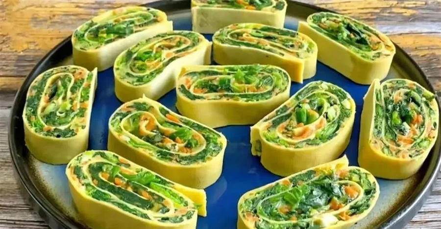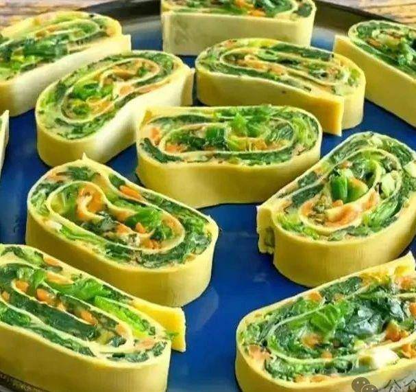 5、再把雞蛋皮攤開,放上擠干水的菠菜葉,從一邊卷起來,盡量卷實一些,用刀把菠菜雞蛋卷切成小塊,均勻地擺入盤中,美味即成。