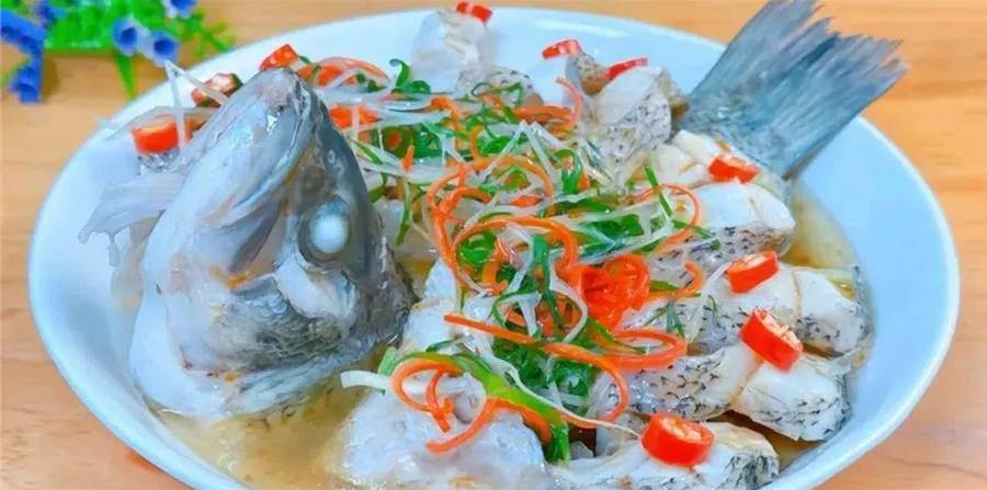 4、蒸熟以后,再轉著圈擺上紅膠圈。然后再把青紅椒絲擺到魚中間,再淋入熱油,激發出香味,最后再放上調好的料汁,清蒸鱸魚就做好了。