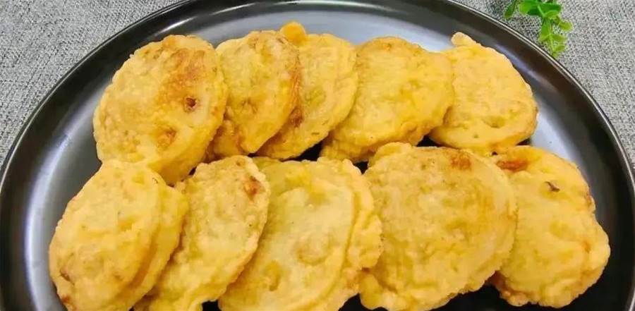 5、鍋中油溫燒至四成熱,把每一個藕夾裹滿面糊,放入鍋中中小火炸至定型,不停地翻動,大概兩到三分鐘,把藕夾撈出,繼續把油溫燒至六成熱,進行第二次復炸,這是酥脆不回軟的關鍵,大概30秒左右,等待表面金黃即可撈出。
