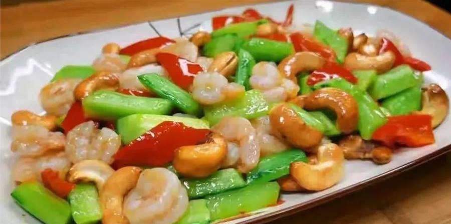 3、鍋中水開,把蝦仁下鍋焯水一分鐘,燙一分鐘撈出。鍋中油熱,下入姜片炒香,再下黃瓜和紅椒至斷生,再加入蝦仁翻炒幾下,然后加入適量食鹽調味,再淋用少許水淀粉,使湯汁濃稠,最后加入一把熟腰果,再次翻炒均勻即可出鍋。