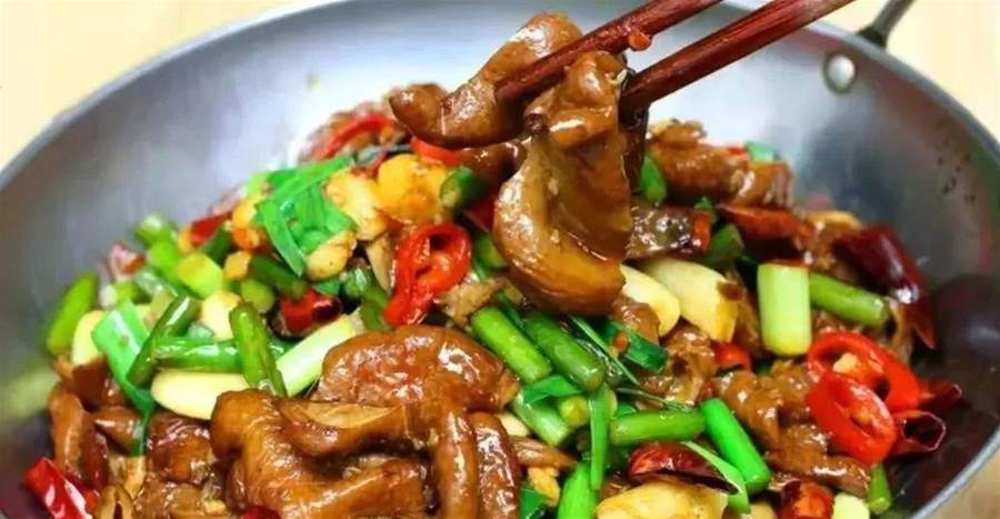 4、起鍋燒油,切好的配料下入鍋中炒香,再放入辣椒花椒煸炒出香味,將肥腸下入快速翻炒出香味,將蒜苔下入鍋中炒至斷生,再來點蠔油和豆瓣醬炒出紅油。
