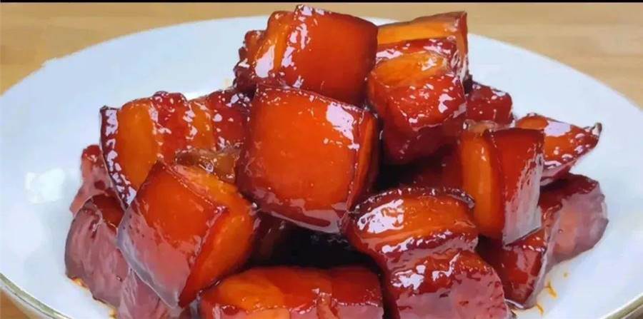 3、準備適量蔥、姜、桂皮、香葉以及山楂,生抽三勺、南鹵汁一勺、料酒一勺,攪勻備用。熱鍋放油,加適量的冰糖熬制冰糖起大泡變深紅色,倒入五花肉翻炒上色。加適量的開水,倒入香料。煮開后蓋蓋,先煮20分鐘,20分鐘后倒入調好的料汁,不用放鹽,再繼續煮15到20分鐘,煮至五花肉軟爛,大火稍微收汁后即可起鍋。