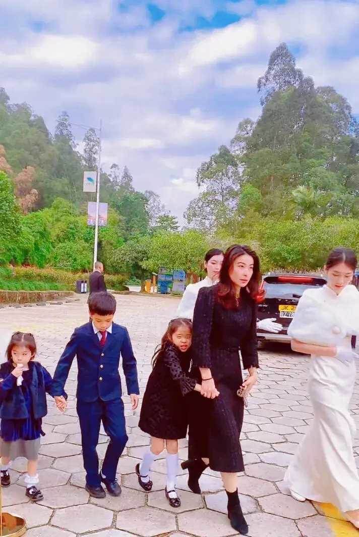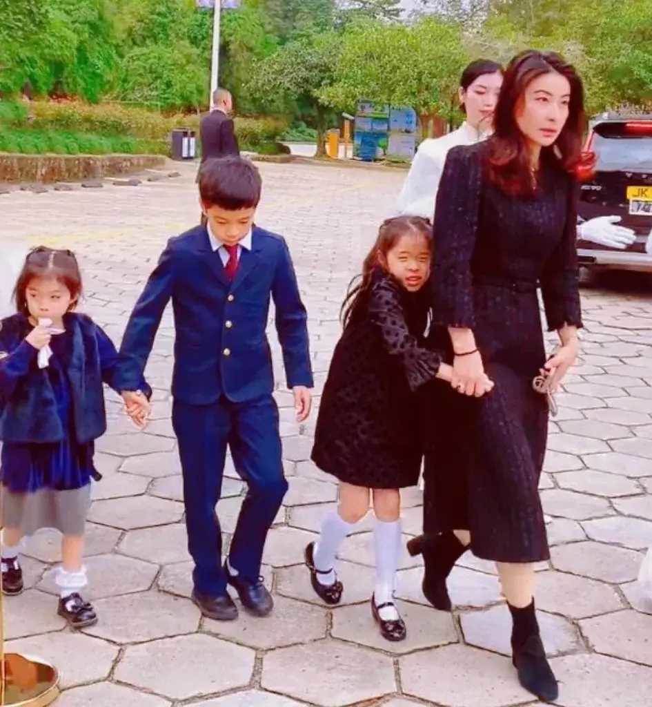 10歲的長子霍中曦身穿深藍色西裝套裝,一身正式打扮就像一個小紳士一樣,非常有范。4歲的小妹妹霍中怡穿著和哥哥同色系的外套和連衣裙,軟萌可愛像小公主。看得出來母子四人的穿衣都是精心搭配過的,一家人在正式場合的打扮都非常得體。