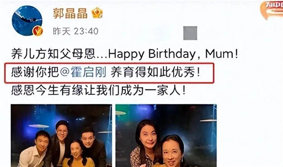 郭晶晶還曾在微博曬出了為婆婆慶生的照片,感謝她把霍啟剛培養得這麼好,有幸與他們成為一家人。