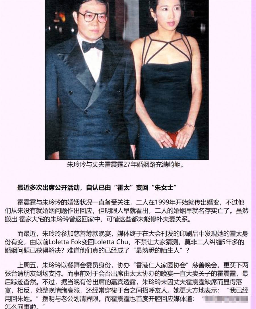 于是在2003年,朱玲玲與霍震霆正式失婚。但為了守護豪門顏面,兩人約定了暫時對外界保密。2005年,兩人失婚的消息才被外界所知。