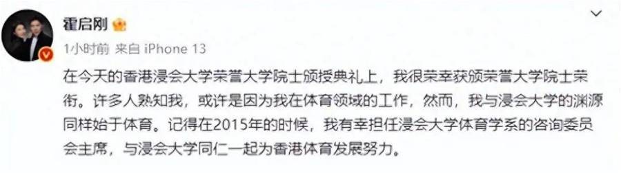 今年9月21日,霍啟剛榮獲香港浸會大學榮譽院士的稱號。