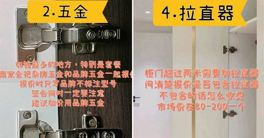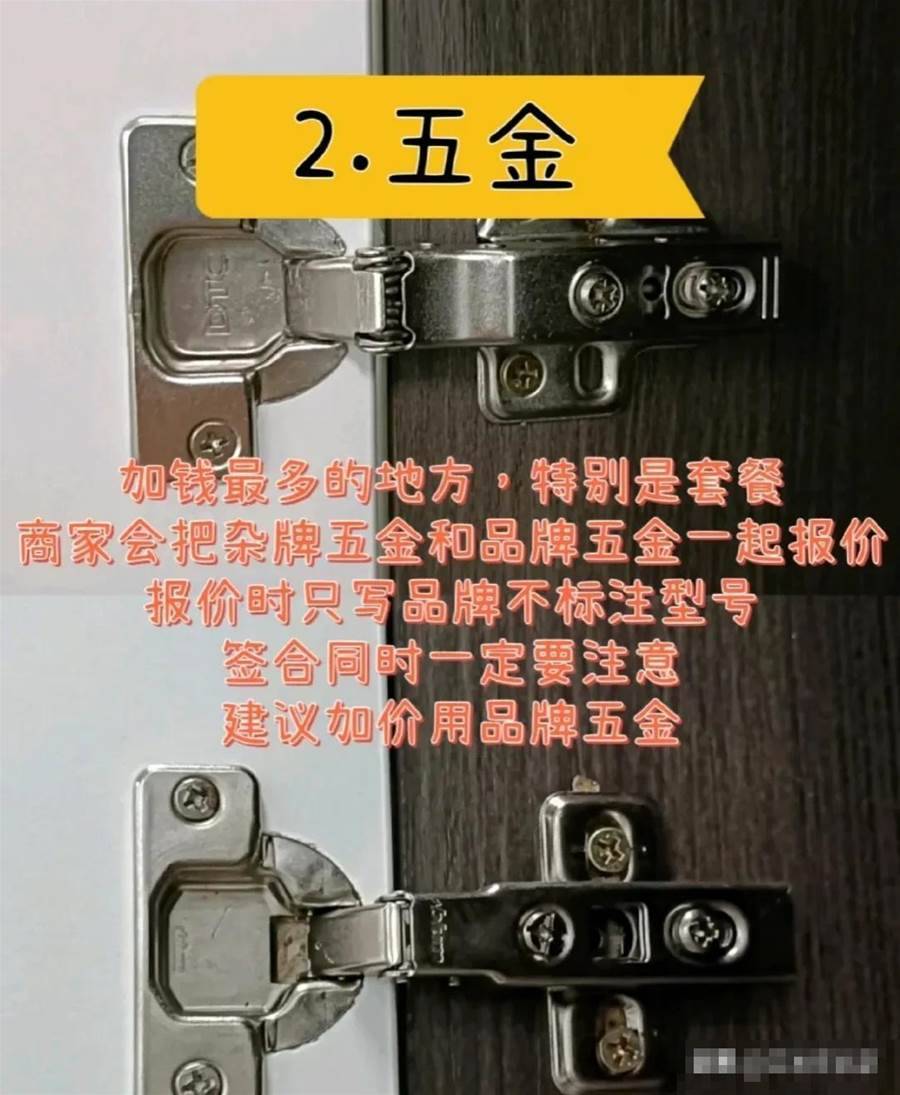 一般按照投影面積收費計算會配置五金,但配的五金是雜牌的,報價時只會標注五金型號,不會標注品牌。所以要問清楚其品牌型號、數量等。如果要升級五金或者配置的數量不夠如何收費