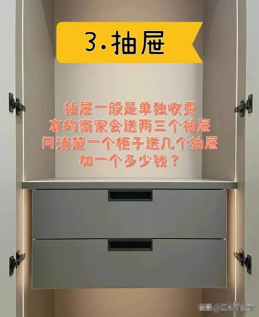 全屋定制的抽屜基本上都是單獨計費的,且抽屜的價格相對較高。所以問清楚套餐內會送幾個抽屜,判斷一下是否夠用。如果加抽屜怎麼樣計費。
