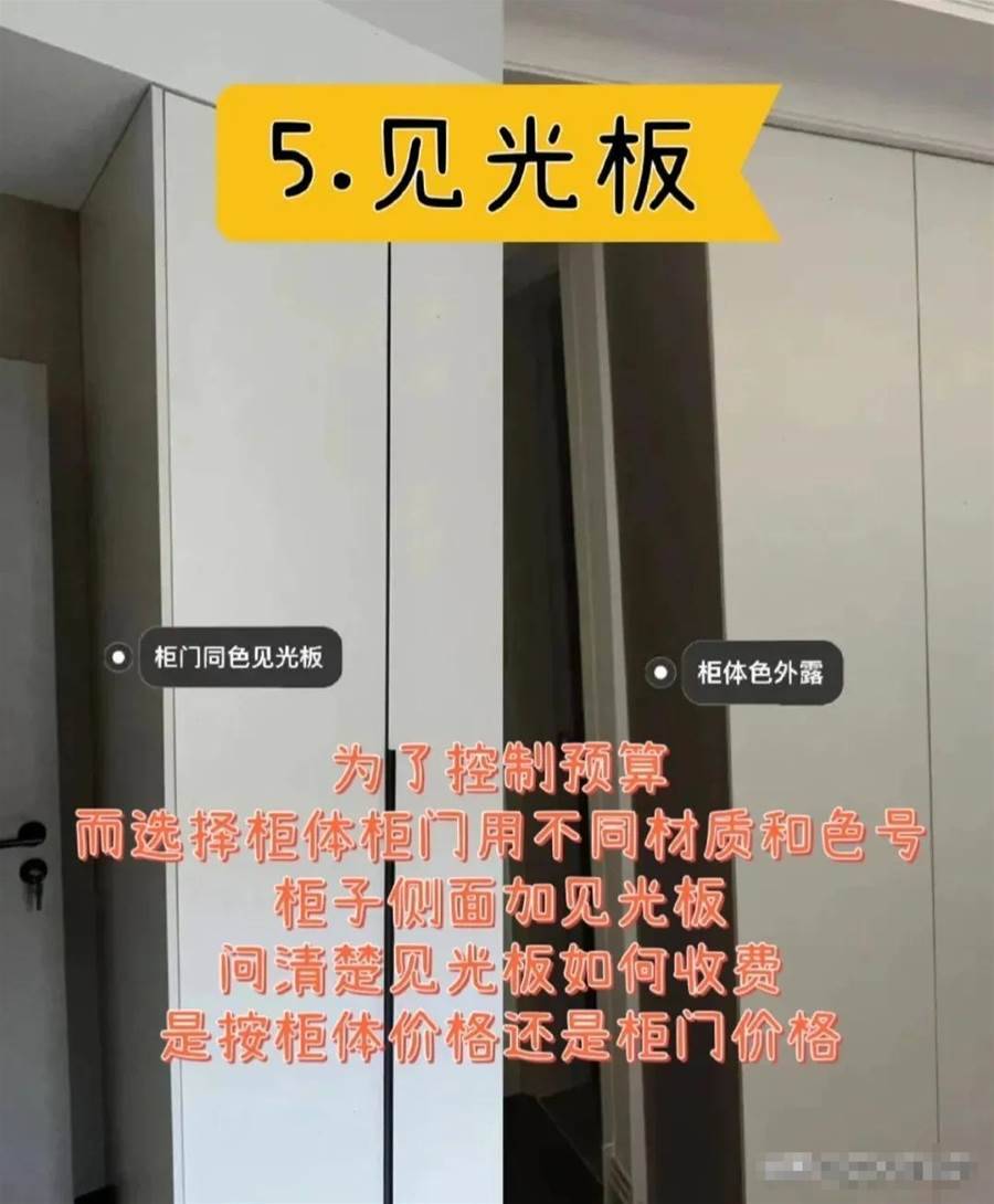 有時候為了控制預算我們可能選擇柜體和柜門的顏色或者材質不一樣,這時候柜子的側面,為視覺效果更美觀,會增加見光板。這個一般會單獨收費,所以需要問清楚具體收費方式,是按照柜體還是柜門?