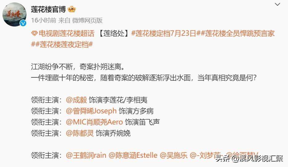 由成毅主演的武侠大男主剧《莲花楼》,终于宣布定档7月23日。改编自藤萍的同名小说,由爱奇艺出品,郭虎和任海涛执导。(本文为溪风影视汇聚独家首发,严禁抄袭洗稿!)