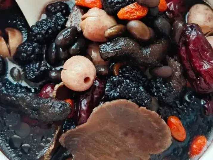 準備食材:桑葚,黑豆,豬骨,黃精,瑪卡,蓮子,紅棗,枸杞子,姜片。