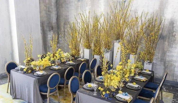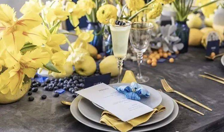 白色、米色、藍色是常見的餐桌花基調。首先要統一餐桌整體為同一色系,然后在某一部分設定一個對比色作為視覺點。例如,利用夏天的季節感做設計時,主色彩為海藍色,加上對比色的黃色,演繹出陽光海岸的氛圍。