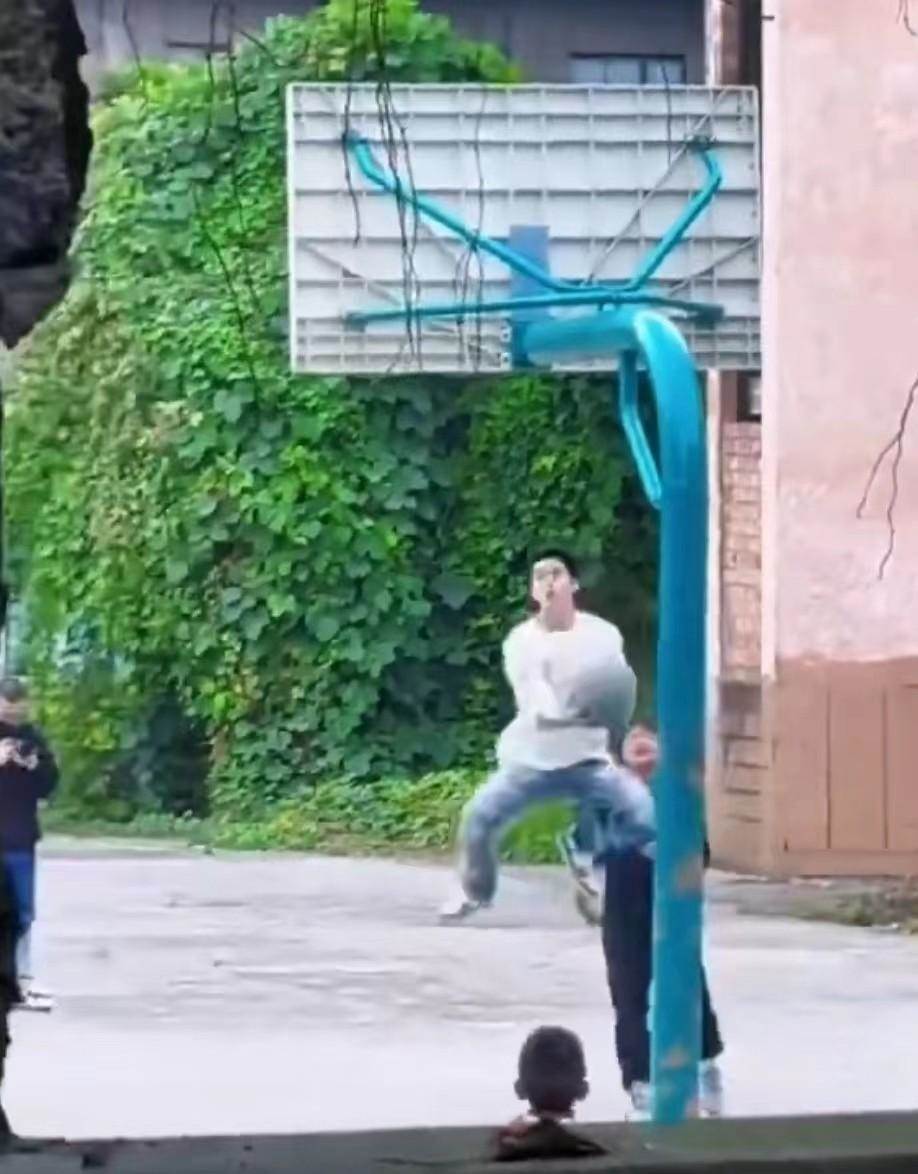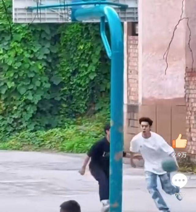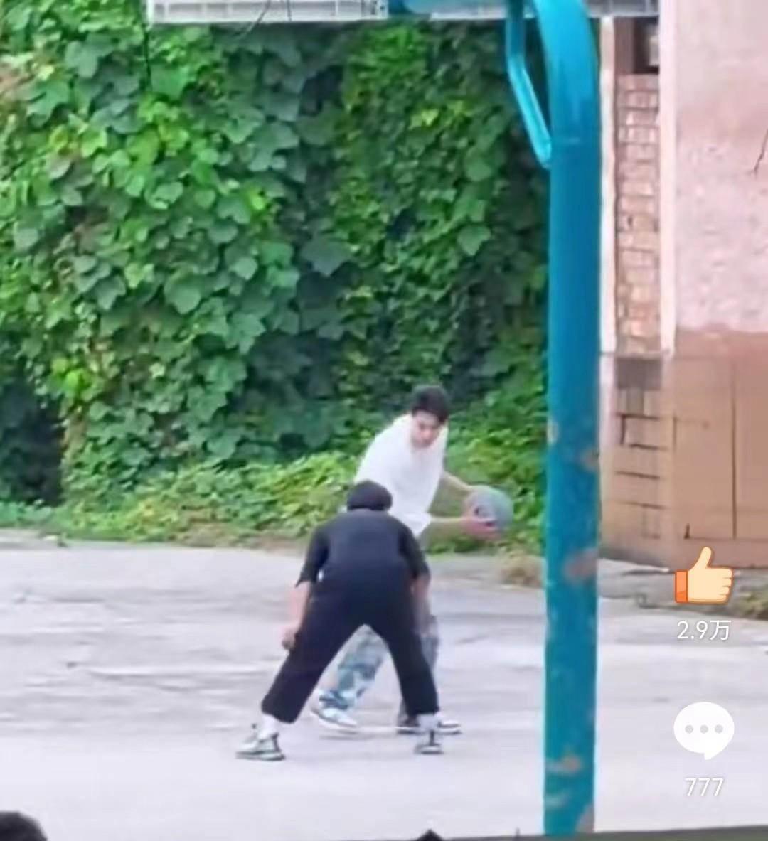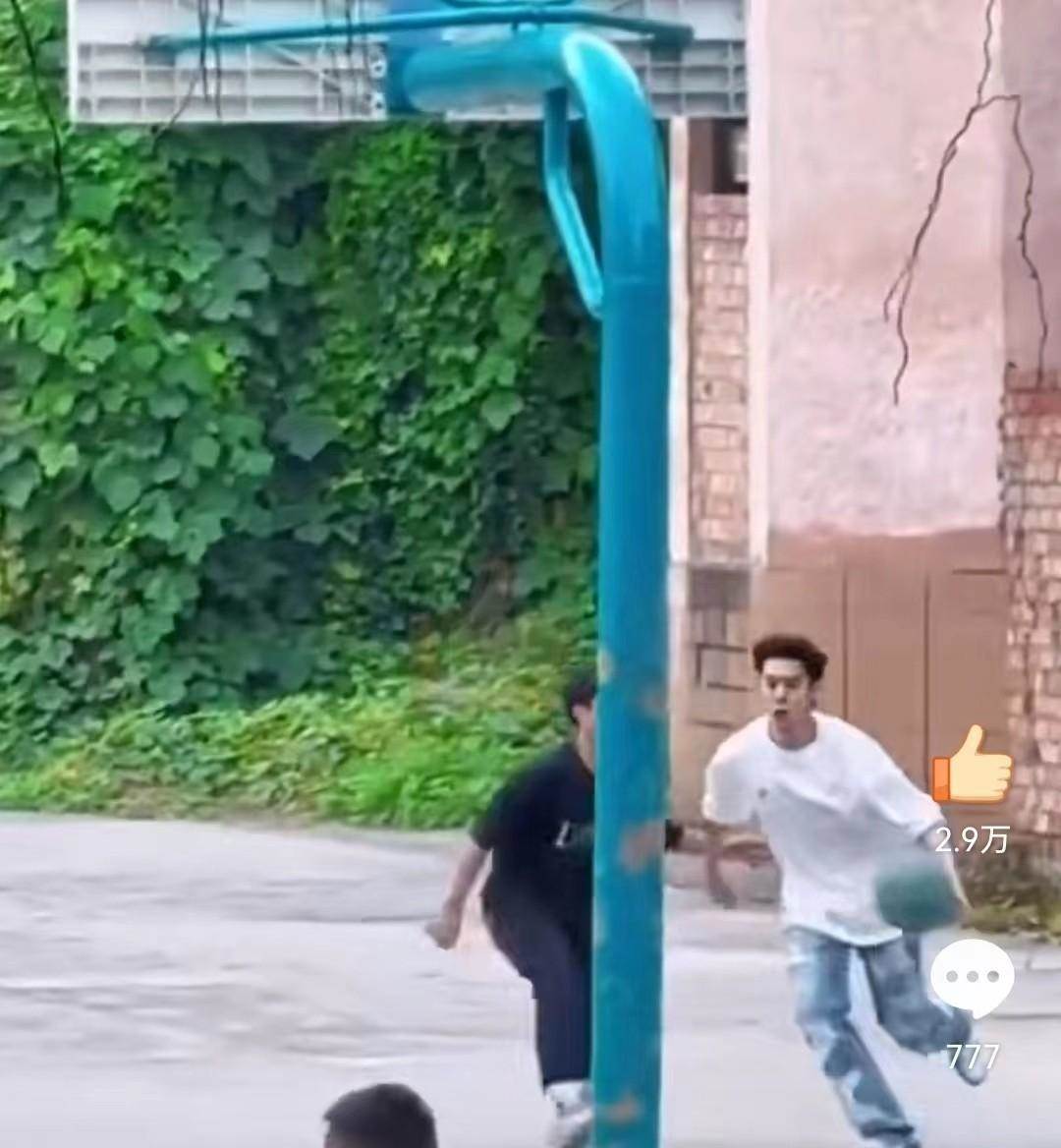 和王鹤棣一对一打球的小孩看起来像是个初中生,王鹤棣轻松突破他的防守三步上篮,可惜并没有投进。