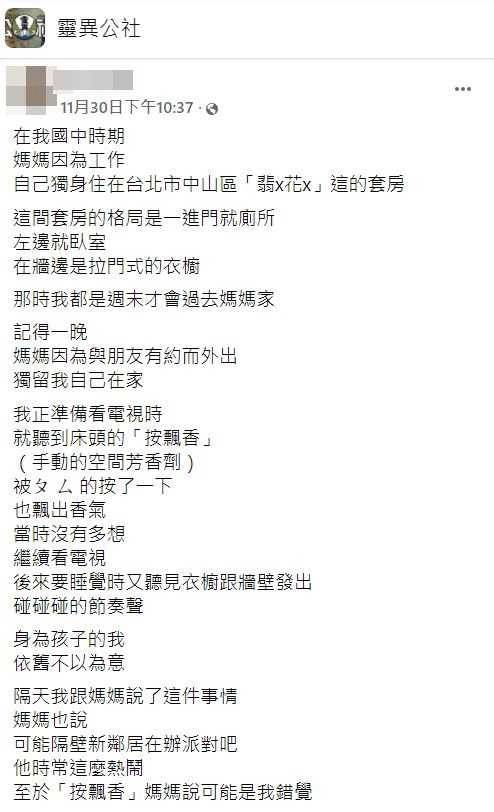 據CTWANT報導,有網友在臉書社團「靈異公社」發文,自己就讀國中時,媽媽為了工作方便、曾獨自在台北租房,自己週末會前去媽媽的租屋處同住。某天,媽媽和友人相約外出、獨留原Po一人在家,床頭上的芳香劑突然被按了一下,原Po沒太在意,但準備睡覺時,衣櫥和牆壁卻又發出怪異聲響。