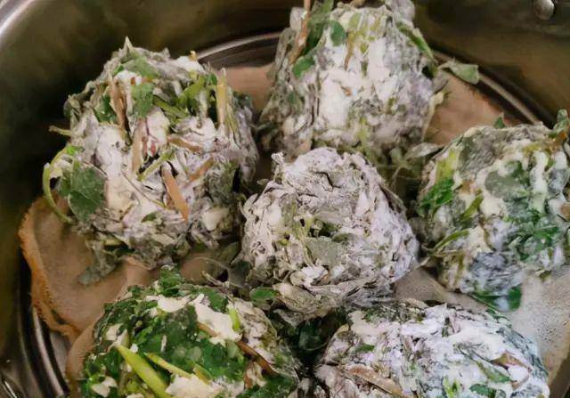 第四步,用食指在中間摁一個窩,做成窩窩頭的形狀,按照這個方法做好,在鍋中添上水,將水燒開,隔水放入馬齒莧窩窩頭,開始蒸;