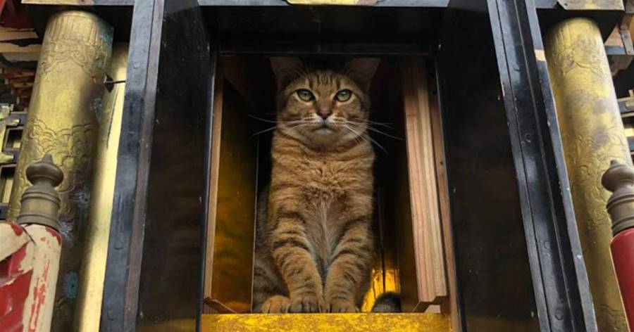 ▼這名網友主要在日本四國德島市內修護神社,工作期間他經常會在戶外偶遇一些活潑的小浪貓,還會順手拍攝下來po到推特上。近日他在修護神龕時,突然有一隻小貓從他身邊走過。他抬頭一看,那原來是一隻虎斑貓,牠表情嚴肅、神態端莊,正坐在神龕中,好像這個位置本來就屬于牠一樣。