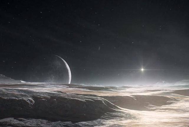 假如從冥王星仰望我們的太陽,看上去的視星等只有-19.4等,肉眼可觀測視直徑也只有1.1角分,就和一顆閃耀的星星一樣而且冥王星的轉軸傾角達到了120度,因此在冥王星上存在很大的極夜和極晝,這會導致它的四分之一表面處于極晝之下,而另外四分之一處終日不見陽光。