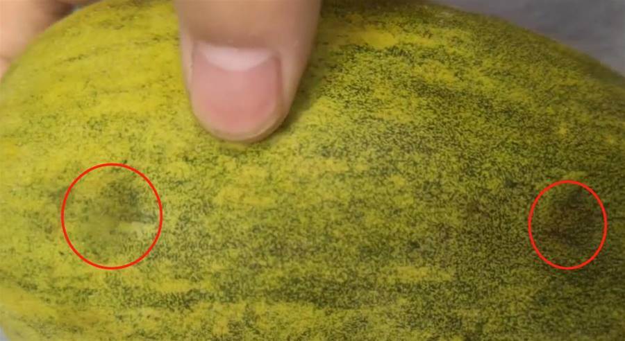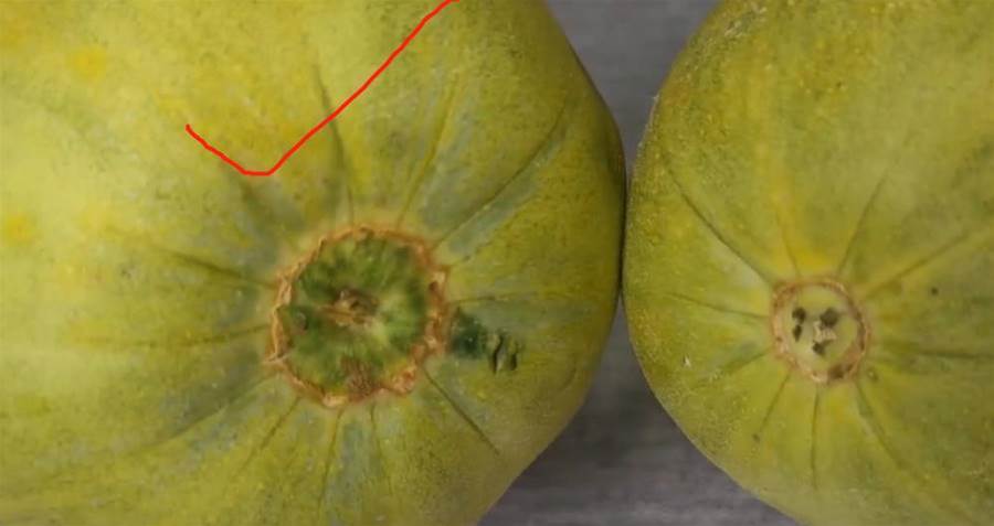 可以看一下左手邊的這個圓圈,比較大的顏色已經深黃色了,聞起來還有一股非常濃郁的香味,那麼就說明這個甜瓜的成熟度已經非常高了。