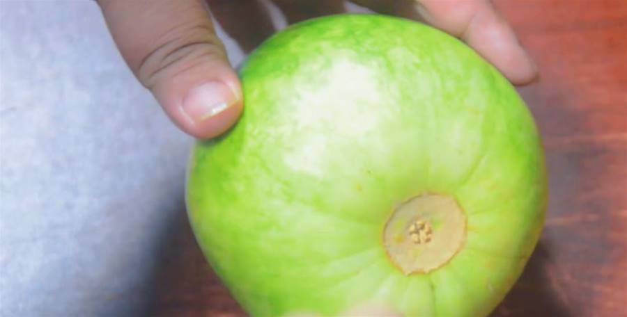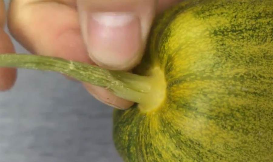 第三點,看尾部。一般這樣的甜瓜都帶著一段果莖,看一下果莖是非常有必要的,拿手輕輕的捏一下,如果里面有水分,就說明這個瓜比較新鮮,是新鮮采摘的,如果已經發干枯萎,這樣的甜瓜最好不要購買,因為采摘的時間已經很長了,里面的果肉難免已經不新鮮了。