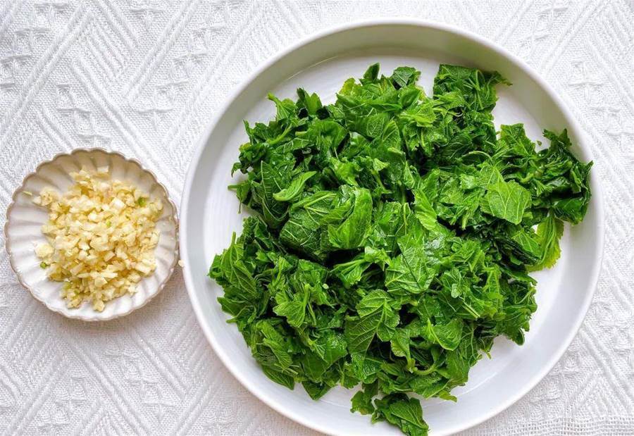 4、焯水的桑葉過涼之后,擠干水分,將它稍微切一些,再準備一些蒜末。
