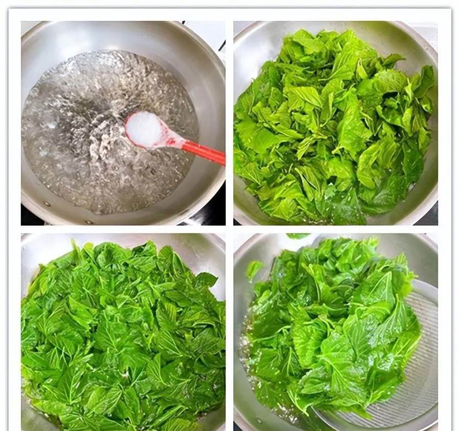 鍋中水燒開,加一勺食鹽和少許食用油,下入桑葉,焯到桑葉變色變軟,大約是45秒鐘左右,出鍋過涼水備用;