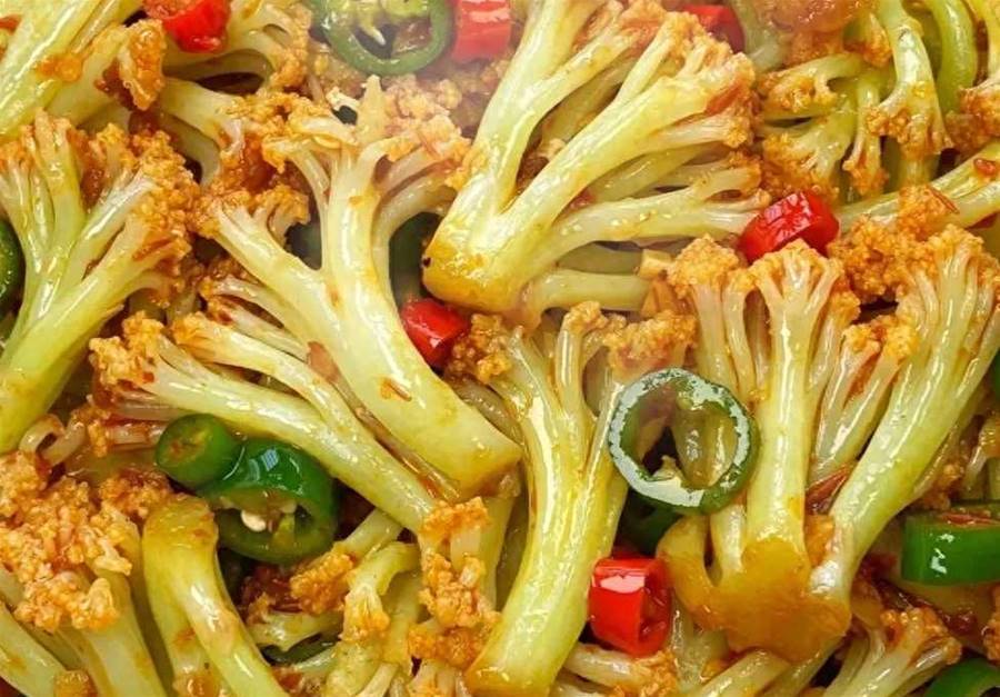 3、起鍋燒油,油熱后放入蒜末和小米辣炒出香味,再放入豆瓣醬翻炒出紅油,然后放入花菜翻炒均勻。