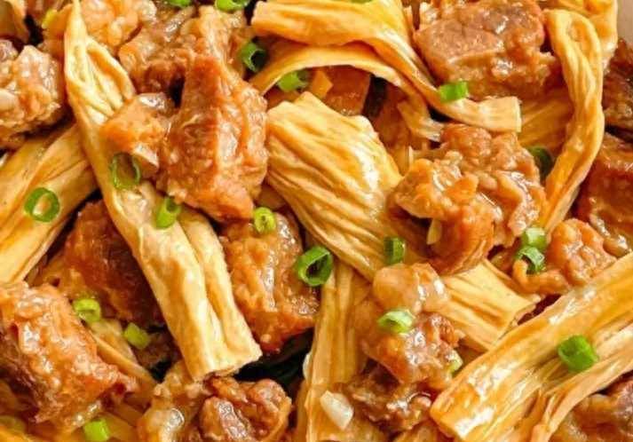 4、腐竹燜煮入味后,開中火收汁,最后撒上食鹽翻炒幾下,撒上蔥花即可出鍋開吃。