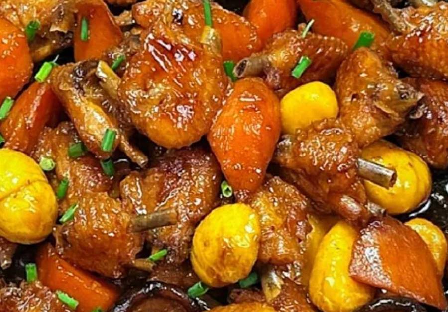 3、起鍋燒油,油熱后放入雞中翅煎一下,煎至兩面金黃,再放入板栗、胡蘿卜和干香菇翻炒一會兒。