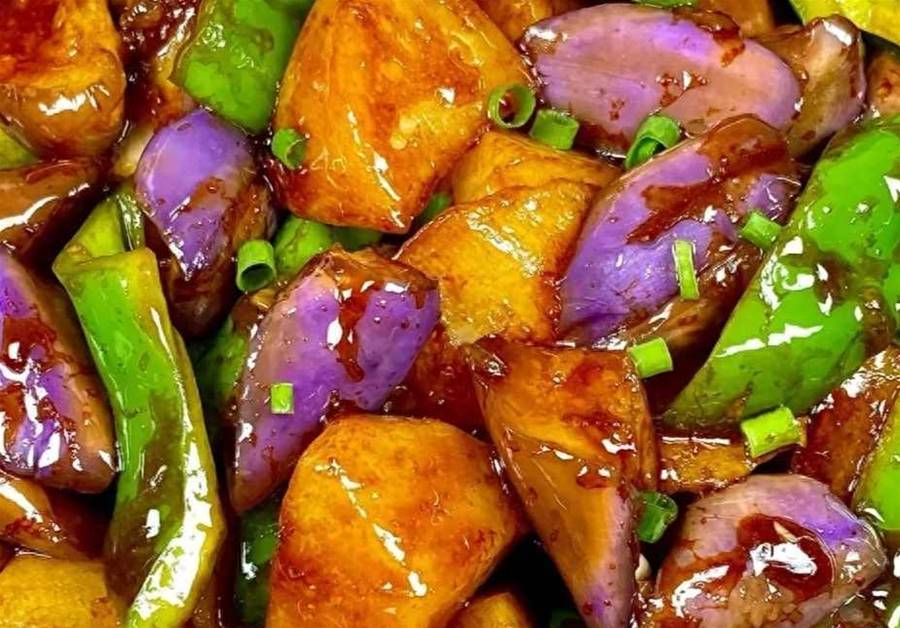 4、蒜末放入鍋中爆香,再倒入土豆、茄子和青椒,快速翻炒均勻。然后放入提前備好的醬汁燜煮一會兒,煮至醬汁濃稠,撒上蔥花即可出鍋開吃。