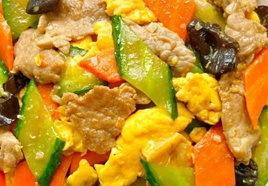 4、再次起鍋燒油,油熱后放入蒜末炒出香味,再放入胡蘿卜、黑木耳和黃瓜翻炒均勻,黃瓜炒至斷生后,放入雞蛋和瘦肉翻炒均勻。