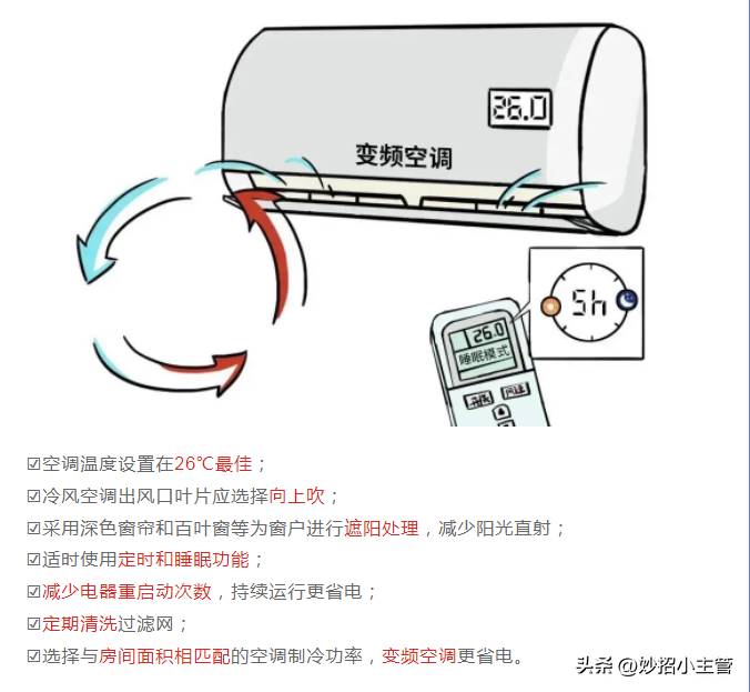 开空调省电原理,也是和冰箱的类似,也是以减少室内外的温度差,同时能保证人在室内舒适。夏季空调,建议是设置26℃,同时设置为eco模式(节能模式),减少空调反复制冷,来保持室内的的低温度。