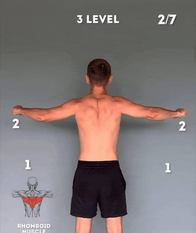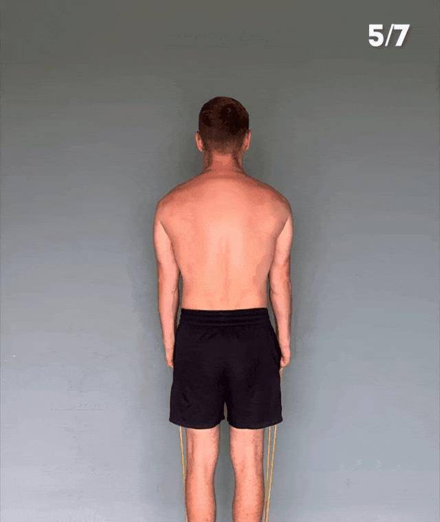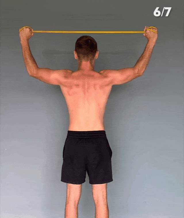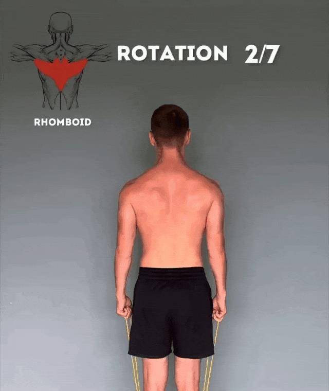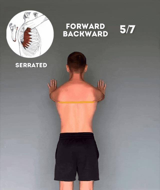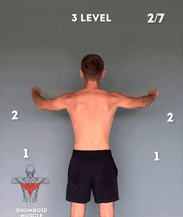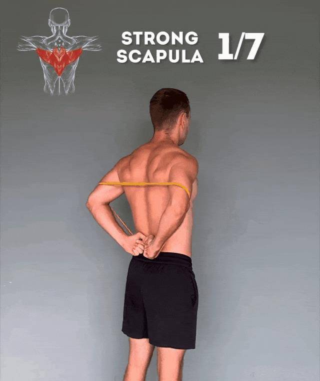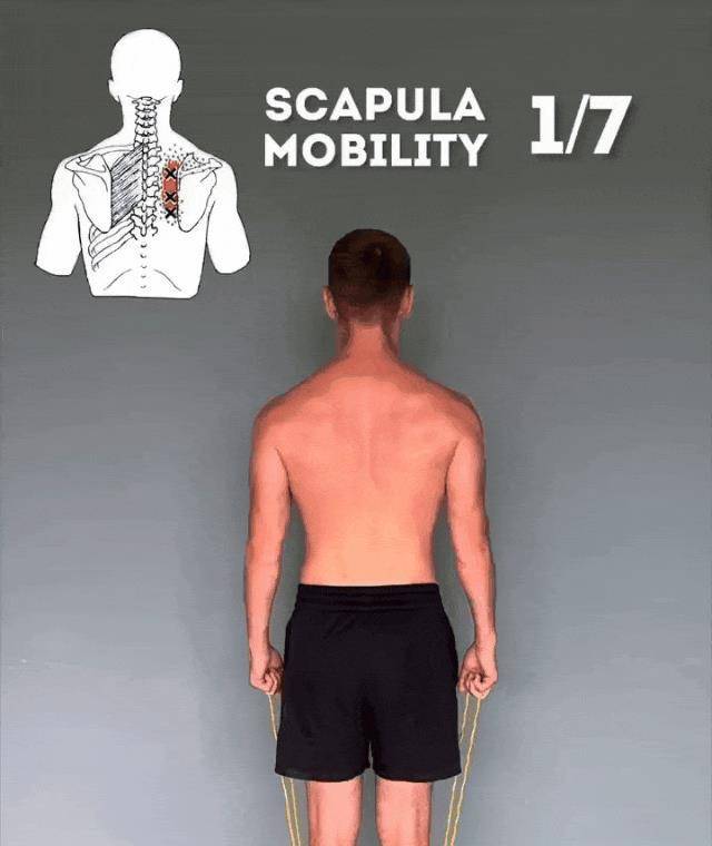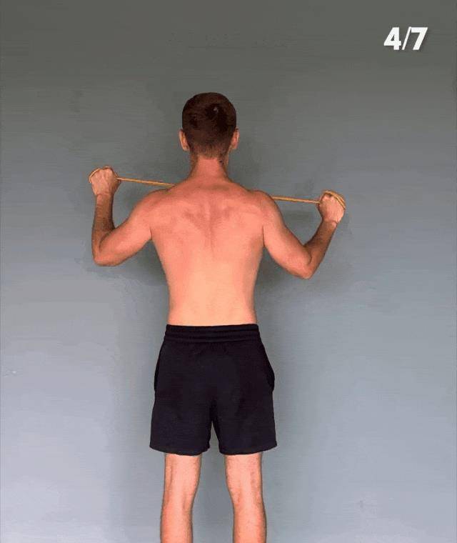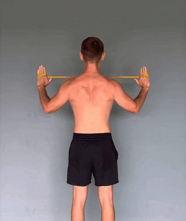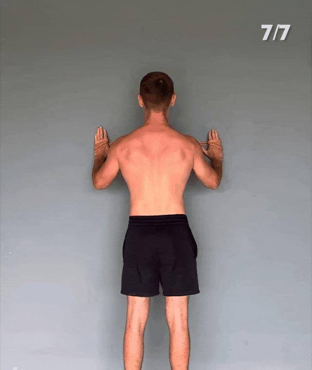 雙手推墻,將彈力帶套在肩胛骨中段位置如上圖Gif演示的位置放好呼氣,收緊核心上背部飽滿向后撐開吸氣,肩胛骨內收重復練習12-15次為一組
